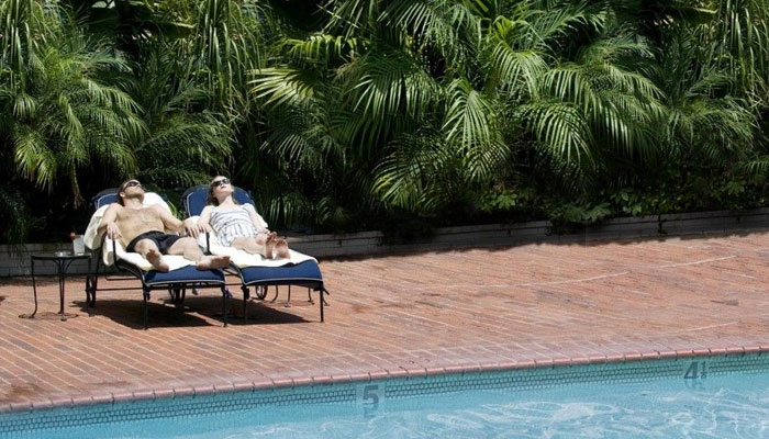 SOMEWHERE’s cinematography befits its simple narrative approach, adopting an observational, rough-edged aesthetic that makes inspired use of old lenses from Francis Ford Coppola’s RUMBLE FISH (1983) shoot to imbue the 1.85:1 35mm film frame with a timeless, vintage aura (1). One of the last films lensed by the late cinematographer Harris Savides, SOMEWHERE revels in the long take, mixing and matching between the formalism of locked-off slow zooms and the immediacy of handheld shots. Savides was a master of harnessing soft and natural light, and SOMEWHERE stands as a testament to his abilities in that regard while reinforcing Coppola’s own established aesthetic. SOMEWHERE contrasts MARIE ANTOINETTE’s vibrant palette of candy-coated hues with a muted color scheme that deals in creamy neutrals and rosy highlights. The film’s opening shot– a long static composition of Marco’s sports car speeding around a closed loop– establishes the elliptical nature of Coppola’s storyline, reinforced by returning editor Sarah Flack’s patient pacing and oblique assembly of key dramatic moments. As in her previous films, Coppola uses music to striking effect, creating a soundscape where well-worn Top 40 hits are primarily heard as a diegetic element that reflects the cultural idea of what constitutes a “Hollywood Lifestyle”. Coppola deviates from this approach only once, laying Julian Casablancas’ mellow track “I’ll Try Anything Once” over a sequence of Marco and his daughter enjoying a fleeting moment of happiness and connection in the hotel pool. The effect is a subtle, yet transcendent moment for the audience as well as the characters. Coppola unifies her disparate musical elements with an ethereal electronic score by French pop band Phoenix (of which her husband, Thomas Mars, is the frontman; continuing the long Coppola family tradition of artistic collaboration with other members).