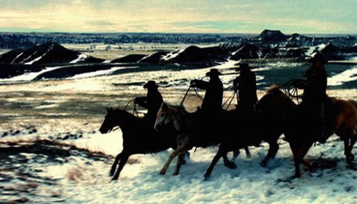 The visuals oscillate wildly in color temperature, running the gamut to cold, warm, and completely desaturated. Contrast is extremely high, creating a stark, dreary look. The skies roil with ominous clouds, threatening the cowboys’ way of life.